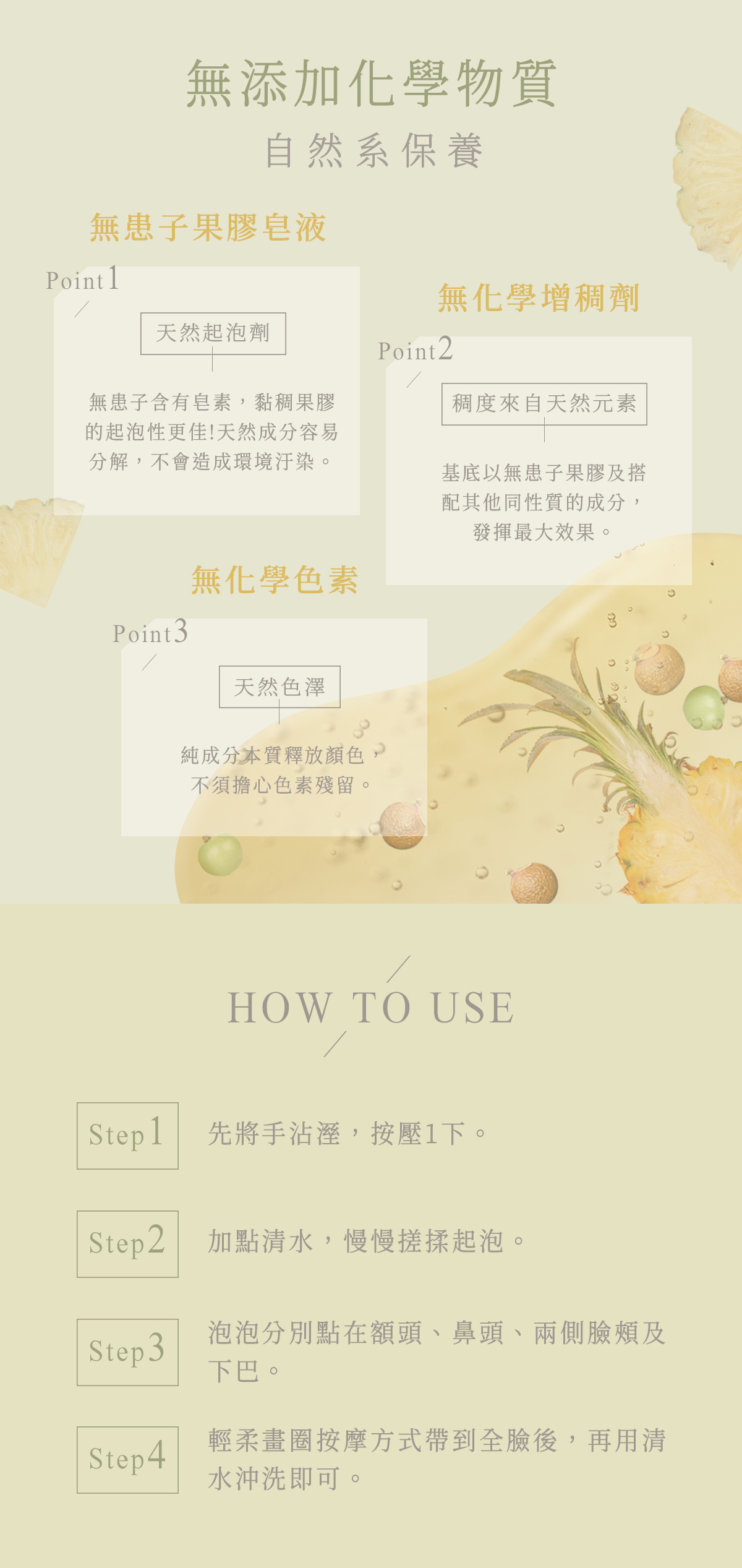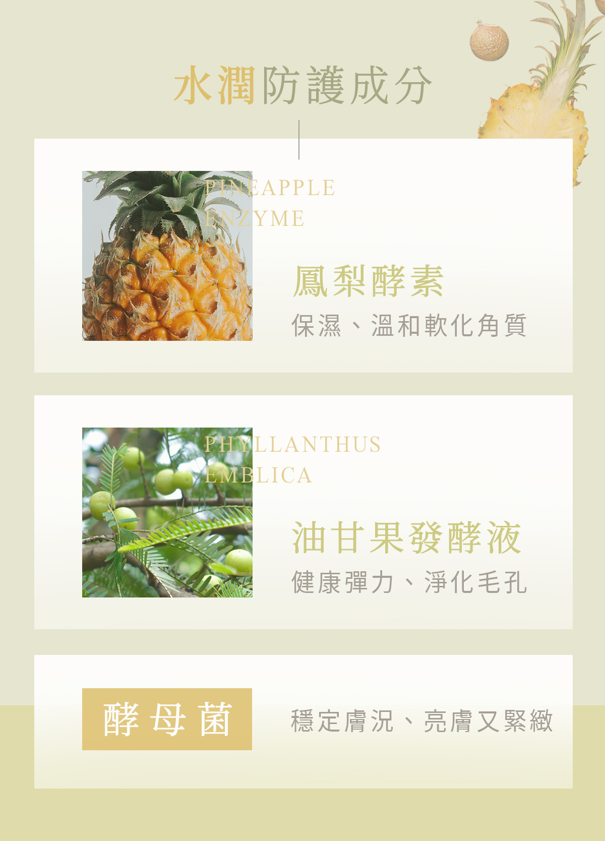 成分 : 無患子果膠皂液、鳳梨酵素、油甘果發酵液、酵母菌
